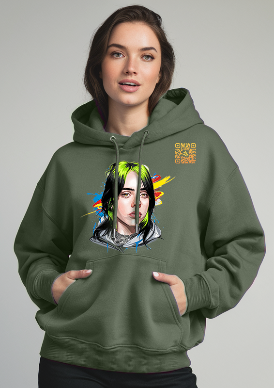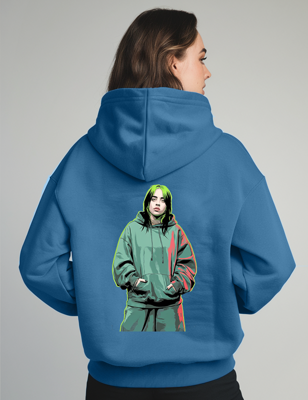 - Back Design: A minimalistic yet striking portrait of Billie in her signature oversized hoodie, blending cool tones with vibrant accents for a standout look.