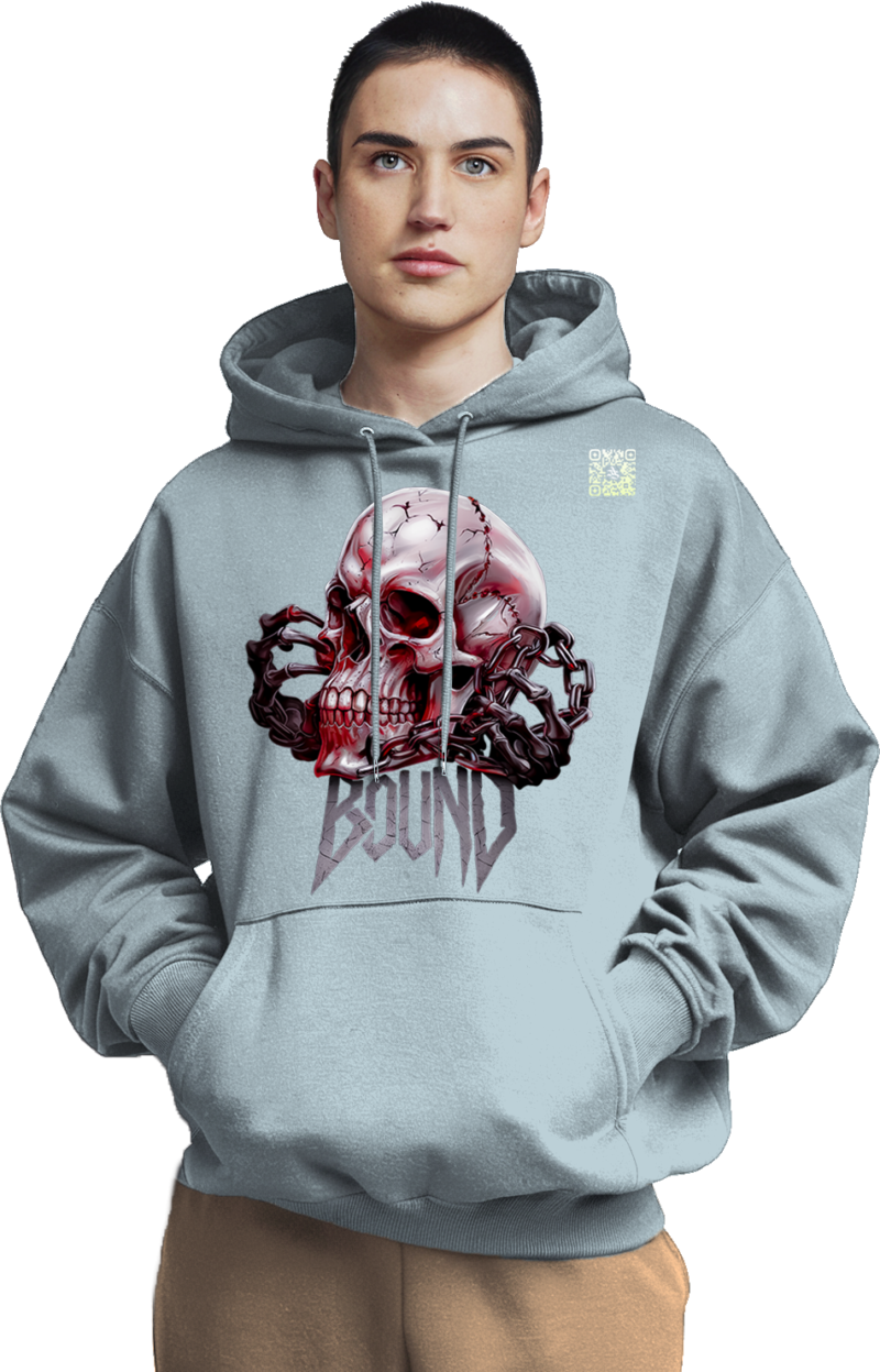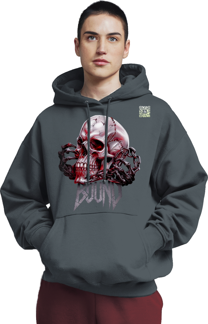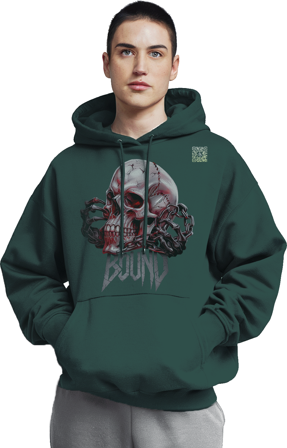 On the front, the hoodie features a fierce skull wrapped in chains with the word “Bound” emblazoned beneath, symbolizing strength and resilience. The back is equally powerful, showcasing angel wings entwined with thorny vines and the words “Divine Wrath,” representing the balance between light and darkness. This unique, eye-catching combination of designs is perfect for those who aren’t afraid to showcase their inner strength and edge.