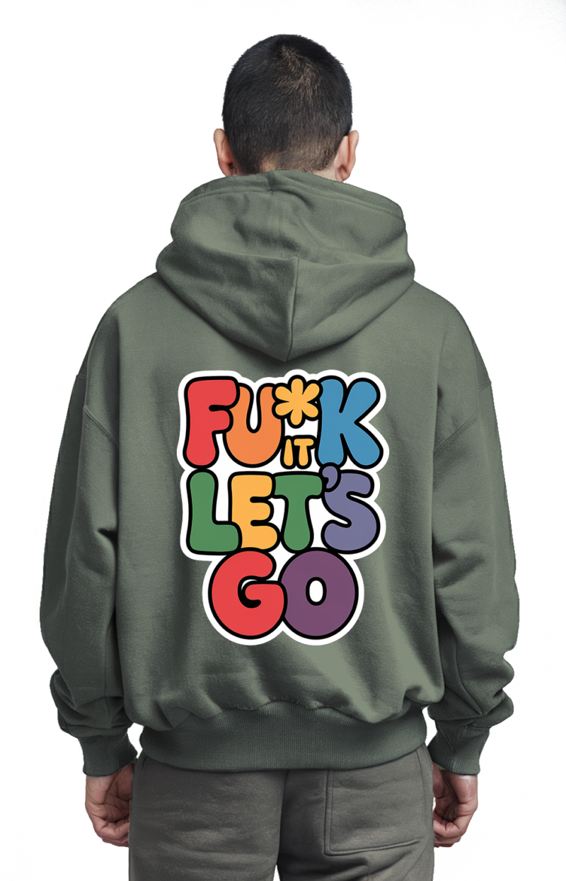 Back Design: The hoodie features a colorful and bold “F**k It, Let’s Go” graphic, inspiring spontaneity and energy. The back graphic is designed with playful typography in a burst of vibrant colors, making it a show-stopper from every angle.