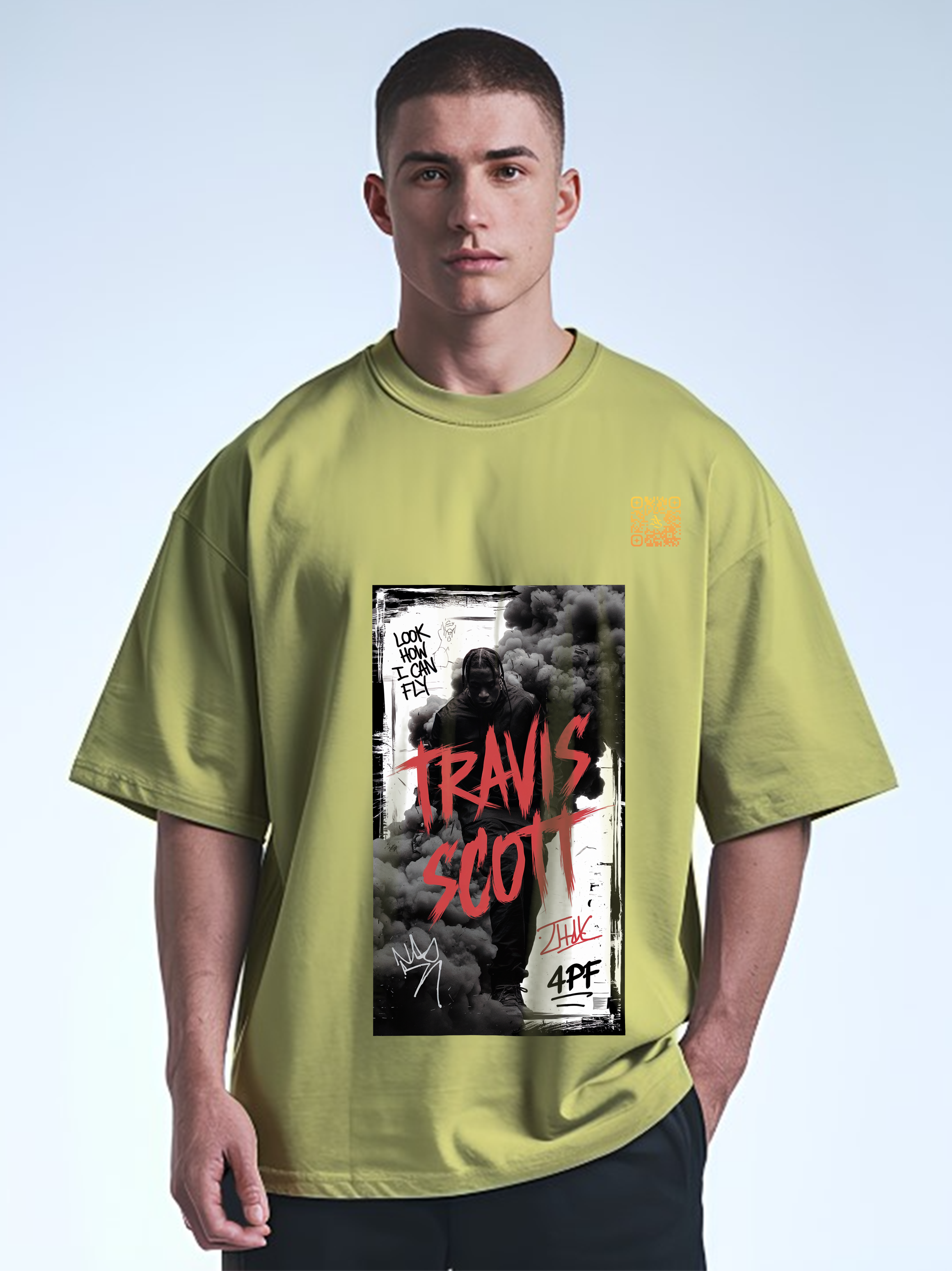 - Front Design: A powerful illustration of Travis Scott amidst clouds of smoke, complemented by graffiti-inspired text, giving it a raw, edgy feel. The bold typography “Look How I Can Fly” amplifies its dynamic energy.